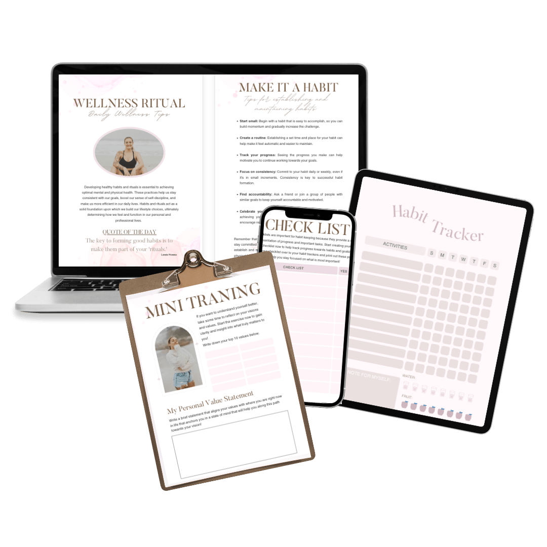 Get instant access to my free Habits and Rituals Workbook – a 23-page guide packed with practical tips, tools, and advice that will help you achieve your personal and professional goals! This free guide includes mini trainings, vision and values workbooks, checklists, morning and evening prompts, journaling prompts, and so much more. Take control of your life today – download my free guide now and make the first step towards achieving your dreams!